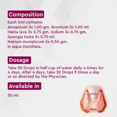 Composition:Each 5ml contains Atropinum 3x 1.00 gm. Bromium 3x 1.00 ml. Hekla lava 3x 0.75 gm. Iodium 3x 0.75 ml. Spongia tosta 3x 0.75 ml. Natrum muriaticum 3x 0.50 gm. In Aqua Destillata.